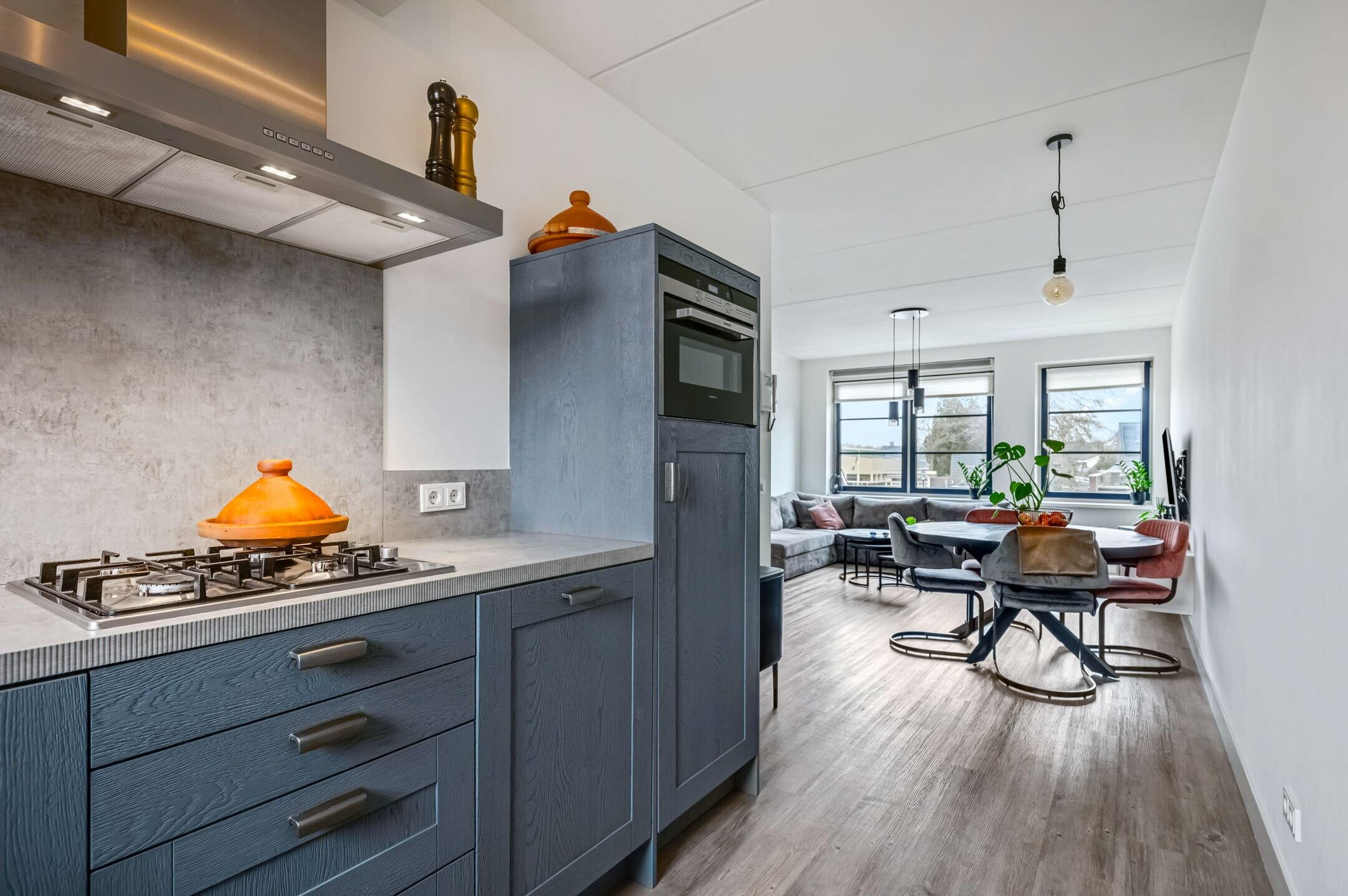 De eerste woonlaag vormt het hart van het appartement en kenmerkt zich door de ruime en lichte living. De entree beschikt over een ruime hal met garderobemogelijkheid en een toilet. Zodra we doorlopen richting de living, valt de ruimte meteen op door de lichtinval vanuit de royale raampartijen aan de voor- en achterzijde. De living biedt meer dan voldoende ruimte voor een comfortabele zithoek, tv-meubel en een eettafel. De moderne keuken is ruim opgezet en is voorzien van onder andere een inductiekookplaat, combi-oven, koelkast en vriezer.