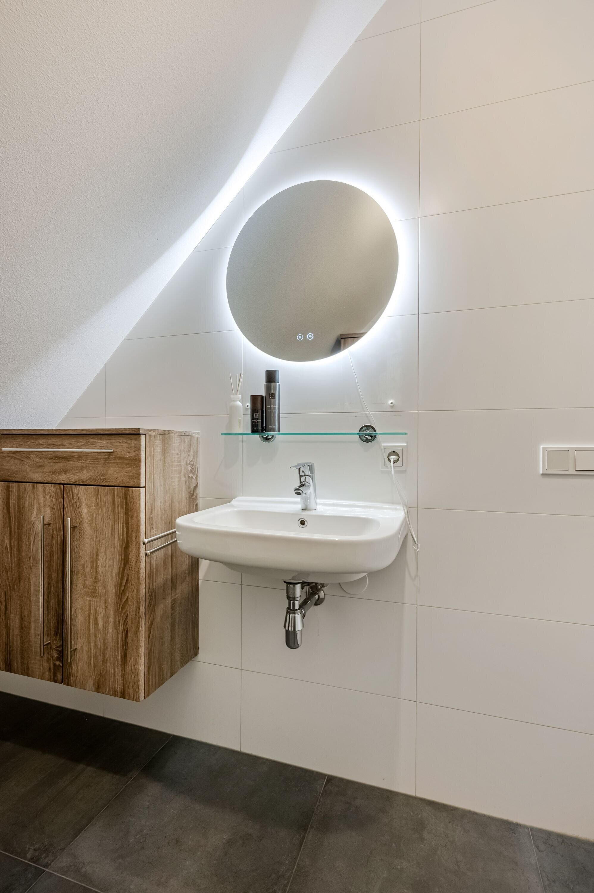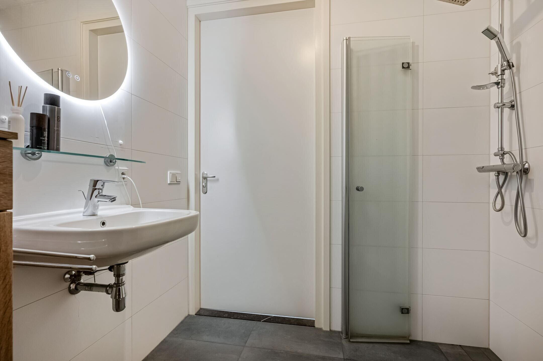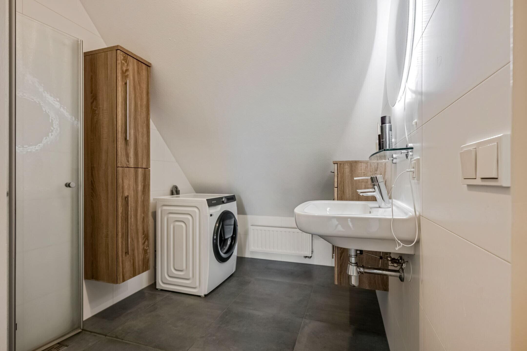 De badkamer is netjes afgewerkt en voorzien van een inloopdouche, een wastafelmeubel en een aansluiting voor de wasmachine/droger.